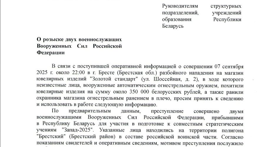 7 сентября в Бресте распространились сообщения о дерзком вооружённом нападении на ювелирный магазин «Золотой стандарт». Согласно документу, оказавшемуся в распоряжении СМИ, двое российских военнослужащих, прибывших на учения «Запад-2025», якобы похитили драгоценности на сумму около 350 тысяч белорусских рублей и ранили охранника.