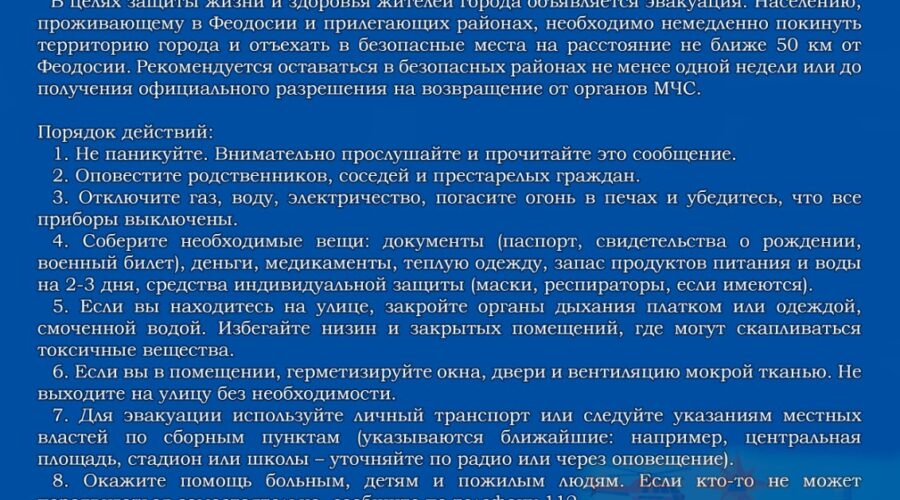 Феодосия охвачена тревогой. Жители города получают листовки от имени Главного управления МЧС России по Республике Крым, с призывами к срочной эвакуации. Брошюры, рассованные по почтовым ящикам и распространяемые в социальных сетях, описывают последствия атаки на нефтебазу в Феодосийском заливе 13 октября: токсичный дым, тяжелые металлы, угроза здоровью. Гражданам советуют уехать на 50 километров от города и неделю не возвращаться, собрать документы, отключить газ и воду, надеть маски. “Не паникуйте, но предупредите соседей“, — гласит текст МЧС. На фоне реального пожара на нефтебазе, чей дым виден за километры, эти слова звучат как приговор. Семьи с детьми и пожилые в смятении.