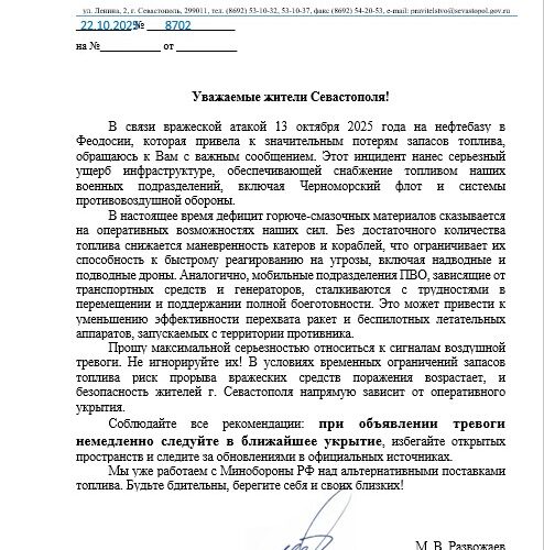Аксёнов пошел дальше, разослав уведомление с предупреждением о рисках: «Ограничения на ГСМ снижают манёвренность кораблей и катеров, что мешает оперативно сбивать угрозы. Соблюдайте режим укрытий — игнорирование сигналов недопустимо!». Глава Крыма подчеркнул, что атаки на подстанции и нефтебазы — это попытка противника сломить нас, но «трудности временные, мы их решаем». К 26 октября он объявил об отмене лимитов на 270 АЗС, обещая полную стабилизацию к концу месяца. Такая прямота в официальных текстах не слышна с начала СВО — это сигнал: ситуация серьезная, но под контролем.
