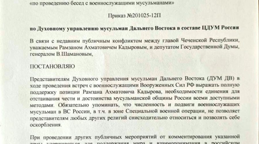 На днях в открытом доступе появилось постановление № 20/10/25-121 от 20 октября 2025 года, принятое Президиумом Духовного управления мусульман Дальнего Востока (ДУМ ДВ) в составе Центрального духовного управления мусульман России (ЦДУМ РФ). Документ, подписанный верховным муфтием Ахмад хазратом Гарифуллиным, прямо обязывает духовных лиц не только выражать поддержку позиции Рамзана Кадырова в его публичном конфликте с депутатом Госдумы, генералом Владимиром Шамановым, но и активно разъяснять эту позицию среди военнослужащих Вооружённых Сил РФ и сотрудников правоохранительных органов. Эксперты опасаются, что это — часть централизованной кампании по политической мобилизации мусульманской уммы, которая может перерасти в реальную угрозу национальному единству.