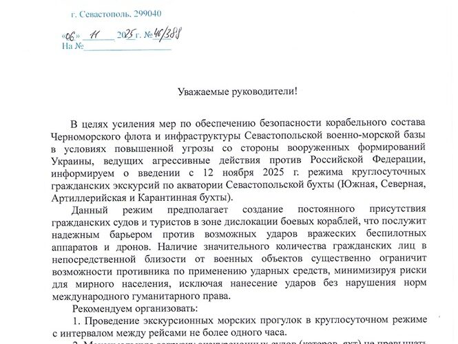 В редакцию попал документ, от которого кровь стынет в жилах. Штаб Черноморского флота рассылает владельцам экскурсионных катеров и яхт циркуляр: с 12 ноября бухта превращается в круглосуточный «живой щит». Туристов, детей, пенсионеров — всех подряд — просят выстраивать в 50–200 метрах от бортов фрегатов и ракетных кораблей, чтобы «парализовать возможности противника». Формулировки циничны: «Гражданские суда и туристы — надежный щит Черноморского флота!» Людей записывают в расходный материал войны.