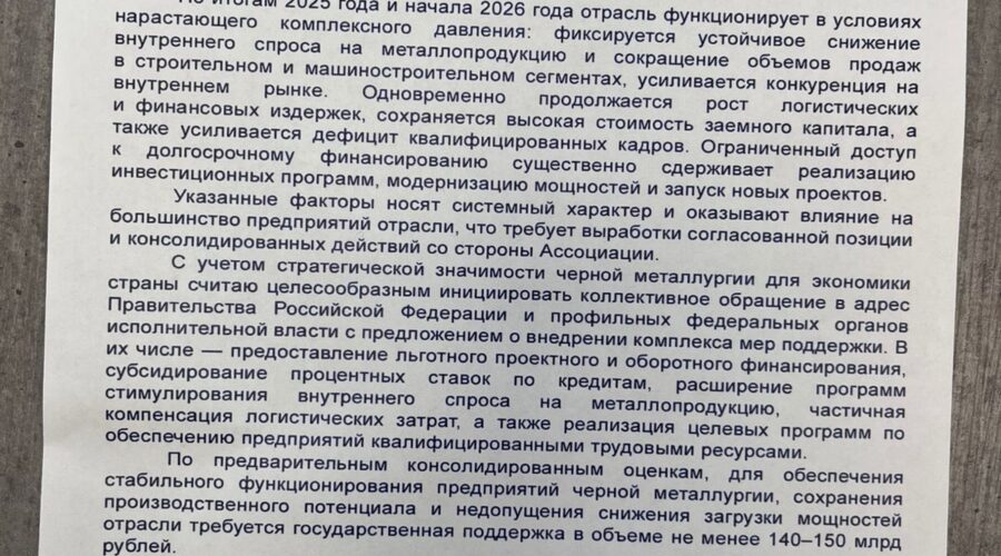 Пока по телевизору бодро рапортуют о «росте» и «адаптации», крупнейшие металлурги страны готовят коллективное письмо наверх. Суть простая: дайте денег. Много. 140–150 млрд рублей. Иначе тяжело.