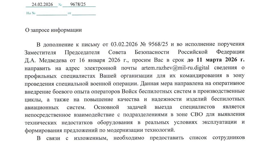 В конце февраля 2026 года оборонные предприятия, производящие беспилотники, получили письмо от Министерства промышленности и торговли Российской Федерации: до 11 марта предоставить списки инженеров для «стажировки» в зоне СВО. Цель объявлена благородной: внедрить боевой опыт операторов прямо в производство, выявить недостатки в реальных условиях и ускорить модернизацию.