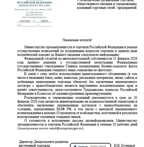 Давайте разберёмся в деталях. Согласно свидетельству о товарном знаке от 11 февраля 2026 года, правообладателем обозначения «Макароны по-флотски» стало Главное командование Военно-морского флота Российской Федерации. Письмо от Минпромторга информирует руководителей торговых сетей и предприятий общепита о необходимости соблюдать исключительные права, а любое использование этого обозначения без лицензионного договора с ВМФ будет считаться нарушением. Более того, рекомендуется заключить до 20 февраля договоры с ВМФ РФ с выплатой лицензионного вознаграждения в размере 10 % от выручки, полученной от использования знака.