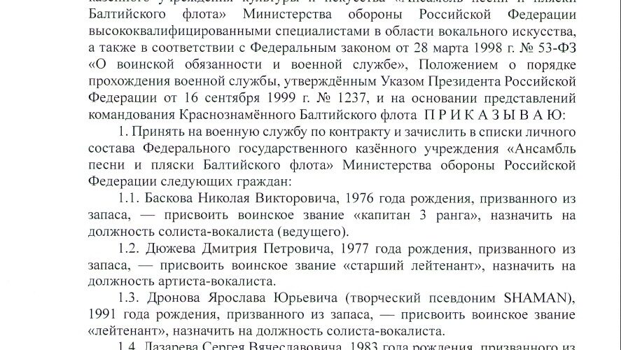 23 февраля 2026 года, в святой для каждого русского человека День защитника Отечества, Главнокомандующий ВМФ адмирал Александр Алексеевич Моисеев подписал приказ № 047. Этим документом в Ансамбль песни и пляски Балтийского флота по контракту зачислены настоящие патриоты, чьи голоса уже не раз поднимали боевой дух наших воинов.